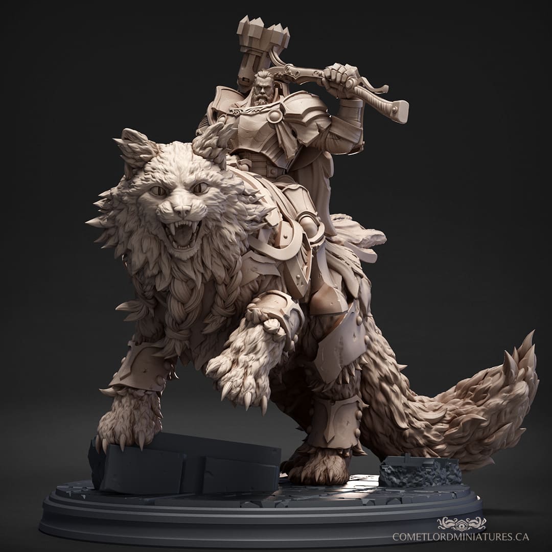 Esta miniatura representa a Adakaius Helstrand, un cazador semigigante y fundador de los Crimson Hunters que desertó de la orden para formar la Rebelión Carmesí. Su imponente figura empuña su característico martillo explosivo, un arma poderosa con cartuchos alquímicos que impulsan el martillo con fuerza explosiva. Tras perder su antebrazo derecho en una batalla contra un señor vampiro, Adakaius lo reemplazó con una prótesis de alta potencia. A su lado su fiel compañera felina Evelyn, una gata terrible revaniana con armadura, lista para destrozar a sus enemigos.