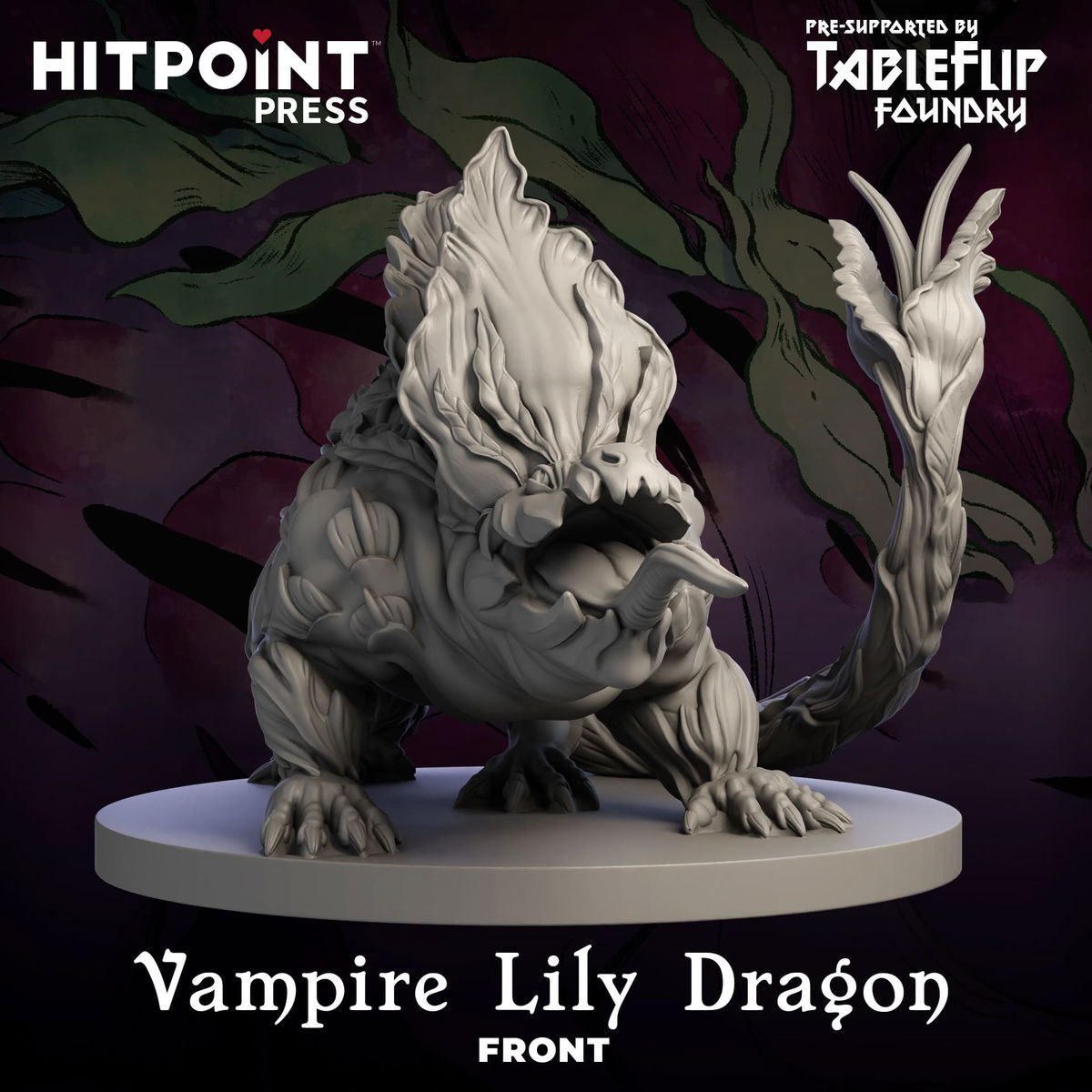 Una miniatura excepcionalmente detallada que representa al Dragón Lirio Vampiro, una criatura cuadrúpeda robusta y letalmente tóxica. Esta miniatura presenta el distintivo volante de pétalos que recorre su lomo. Destaca la larga cola musculosa rematada con la singular flor rizada y los dos espádices en la punta, así como su larga lengua que se asoma de sus poderosas mandíbulas reptilianas.