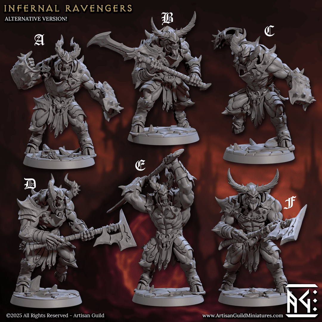 Imponentes guerreros demoníacos de piel carmesí, dotados de enormes cuernos y mandíbulas forjadas en hueso. Los Devastadores Infernales sons soldados implacables y disciplinados que encarnan la furia de los reinos infernales. Armados con armamento arcano forjado en las llamas primigenias representan la fuerza bruta y la voluntad conquistadora del Infierno, siendo los enemigos jurados de los Malakim.
