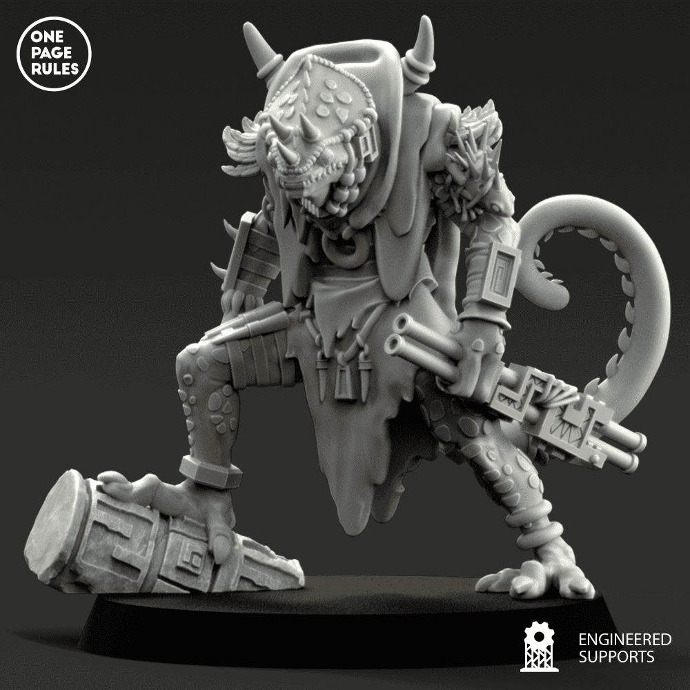 Esta miniatura se ha creado con tecnología de impresion 3D avanzada y precisión, lo que resulta en detalles notables en cada aspecto, desde las escamas camaleónicas hasta las armas que porta.