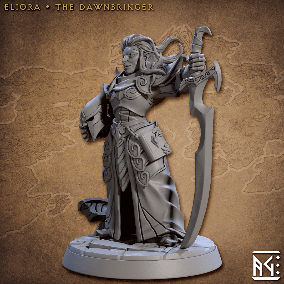 - La miniatura de Eliora es impresa con gran detalle, capturando la elegancia y la gracia de los Altos Elfos. Cada placa de su armadura, cada página de su libro sagrado, y el filo de su Gran Espada han sido impresos con precisión.