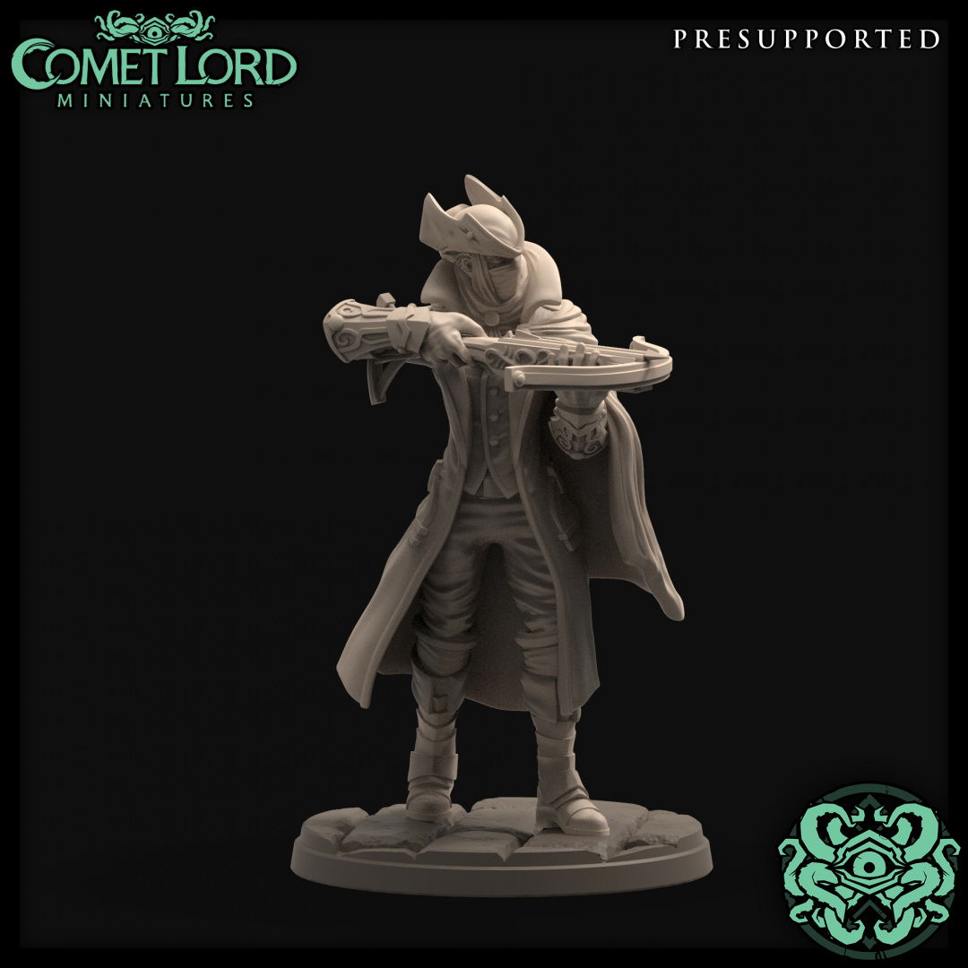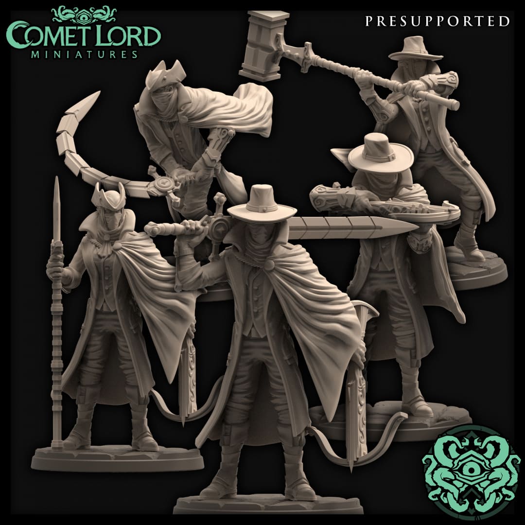 Estas miniaturas representan a los cazadores carmesi, una orden de cazadores de monstruos encapuchados que utilizan un arsenal de armas versátiles. Sus grandes espadas en cadena pueden transformarse en látigos con hojas, sus lanzas pueden convertirse en martillos y sus ballestas les permiten disparar a sus enemigos voladores.