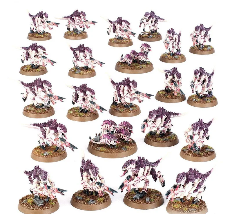 "Los termagantes son depredadores que atacan en enormes enjambres, armados con armas vivientes que escupen organismos carnívoros y espinas venenosas. Originalmente creados para recorrer los estrechos pasajes arteriales de las naves colmena y cazar intrusos, los termagantes acosan a sus presas con una lluvia de fuego, buscando siempre flanquearlas y envolverlas mientras diezman sus filas."